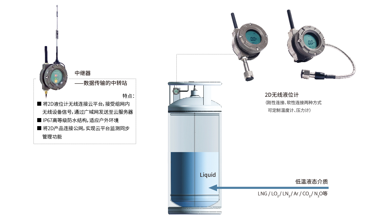 整套系統(tǒng)只通過(guò)一套數(shù)據(jù)中繼器及每個(gè)液氮罐杜瓦瓶上的無(wú)線液位計(jì)即可實(shí)現(xiàn)多終端的無(wú)線上網(wǎng),數(shù)據(jù)互聯(lián).